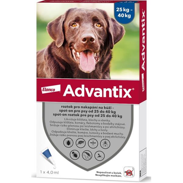 Podrobný popis- Advantix spot on je vhodný k léčbě a prevenci napadení blechami a klíšťaty pro psy o hmotnosti 25-40 kg
