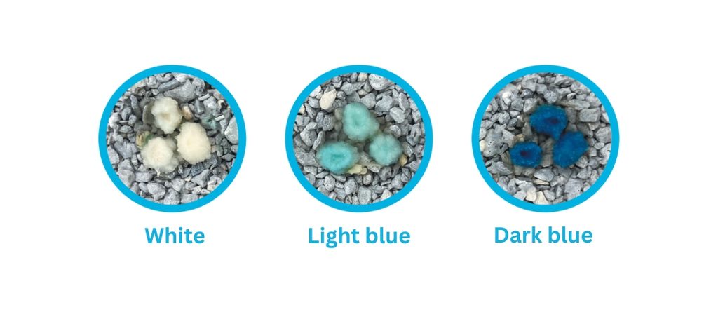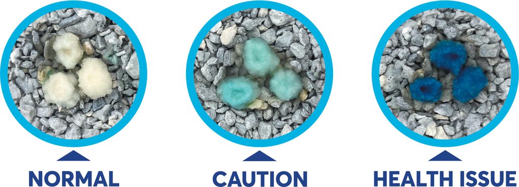 Diagnostické granule Blücare jsou součásti balení, zvlášť v samostatném sáčku. Po naplnění bedýnky stelivem je třeba tyto granule na povrch rovnoměrně nasypat.