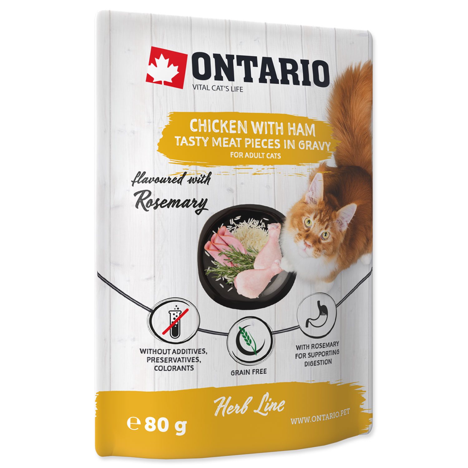 Doplňkové krmivo pro dospělé kočky – lahodné kousky kuřecího masa se šunkou a rýží v chutné omáčce. Speciálně ochuceno rozmarýnem.