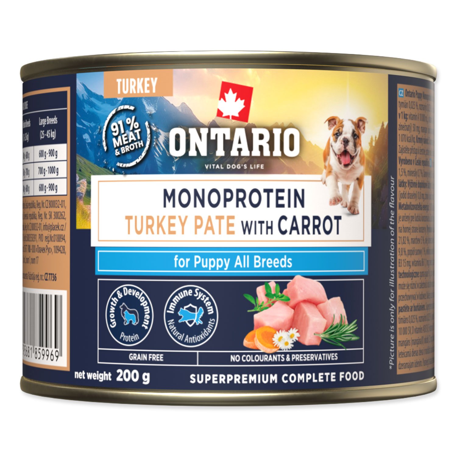 Podrobný popisKonzerva Ontario Puppy monoprotein krůtí pate s mrkví