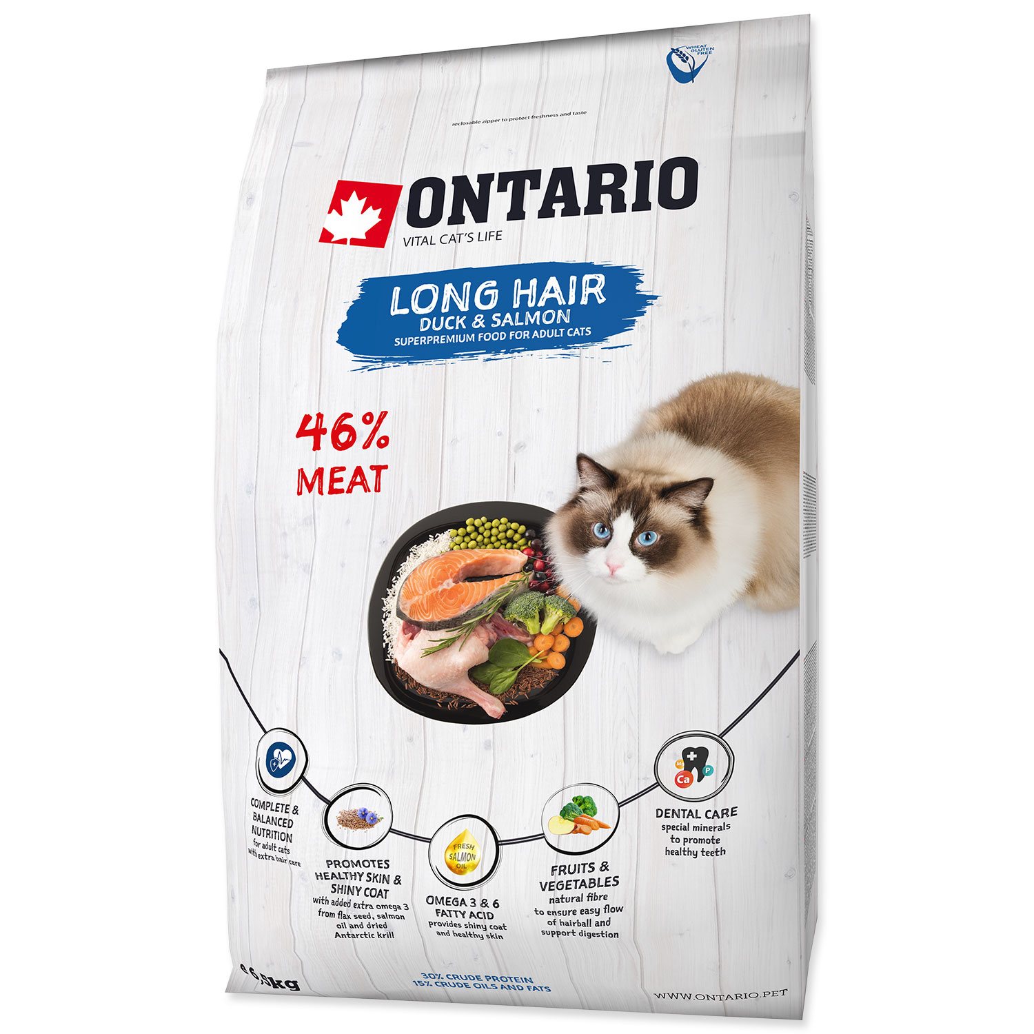 Vysoce kvalitní, superprémiové krmivo pro dospělé kočky s nízkým obsahem obilovin. Speciálně vyvinutá receptura určená pro dlouhosrsté kočky, má bohatě a nutričně vyvážené složení, které je základním pilířem pro zdravý a dlouhý život. Na prvním místě jsou kvalitní zdroje proteinu z kachního a kuřecího masa, pro zajištění ještě vyšší chutnosti a kvality je přidáváno čerstvé maso z lososa. Pečlivě vybrané sušené ovoce a zelenina dodávají organismu potřebné vitaminy, pomáhají trávení a usnadňují průchod bezoárů. Ale nejen to, s kombinací bylinek a koření, pomáhají chránit buňky díky jejich silným antioxidačním účinkům a tím organismus chránit před nemocemi. Krmivo podporuje kvalitu a lesk srsti přidáním extra omega 3 mastných kyselin, které jsou obsaženy ve lněném semínku, lososovém oleji a antarktickém krilu. O ústní dutinu se starají speciální minerály, které přispívají zdraví zubů.