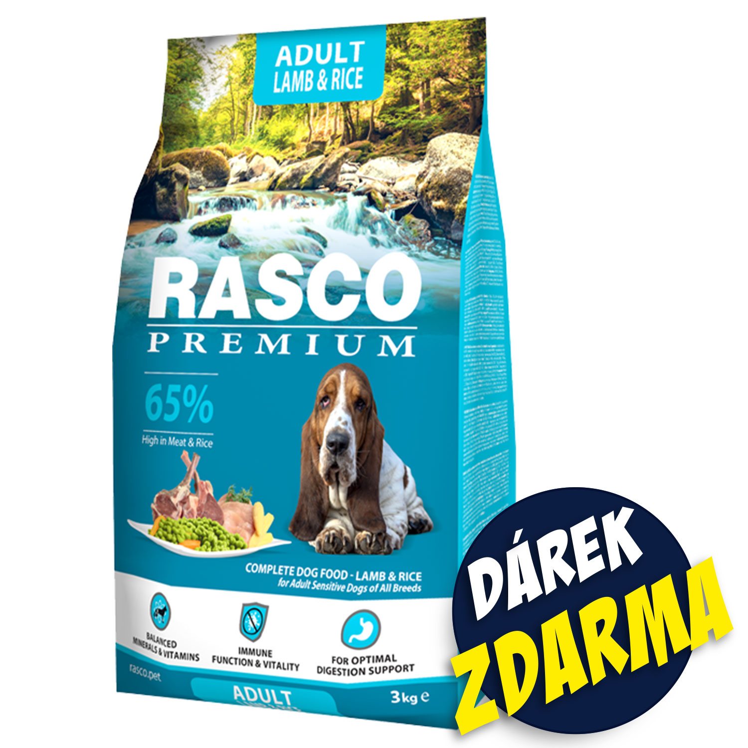 Krmivo Rasco Premium Adult jehněčí s rýží 3kg+Pochoutka Rasco Premium 80g