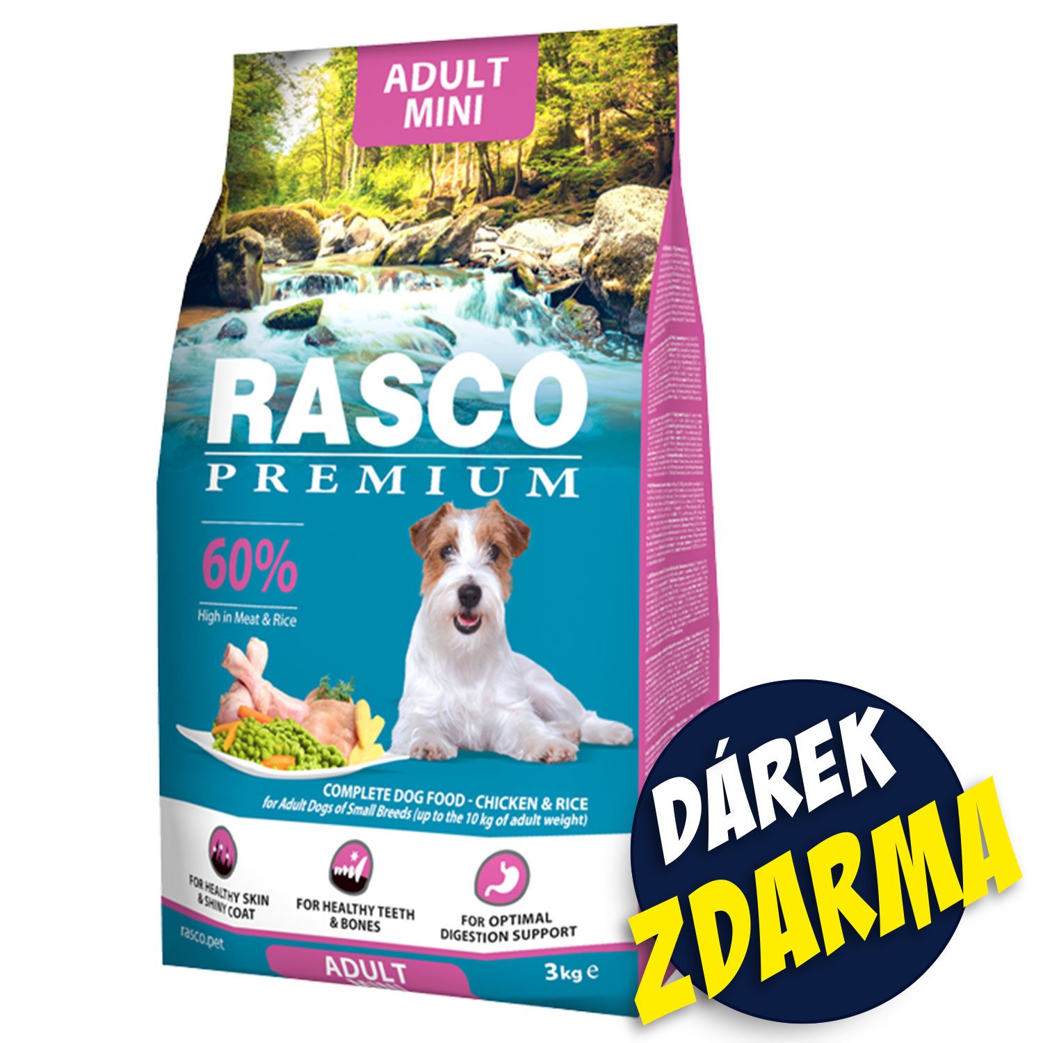 Krmivo Rasco Premium Adult Mini kuře s rýží 3kg+Pochoutka Rasco Premium 80g