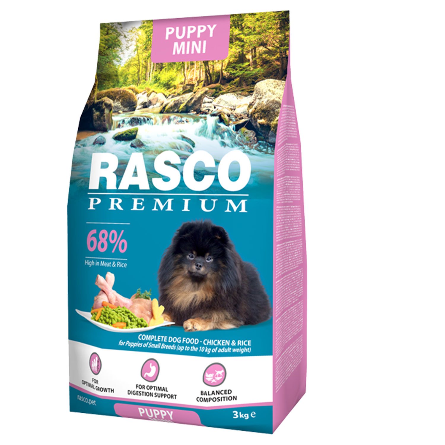 Krmivo Rasco Premium Puppy Mini kuře s rýží 3kg+Pochoutka Rasco Premium 80g