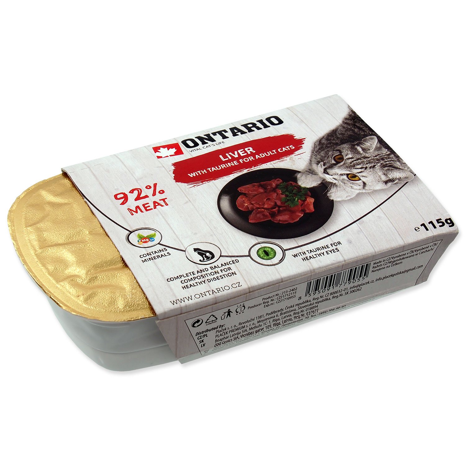 Maso a vedlejší produkty živočišného původu 92 % (z toho hovězí játra 10%, kuřecí maso), minerální látky.